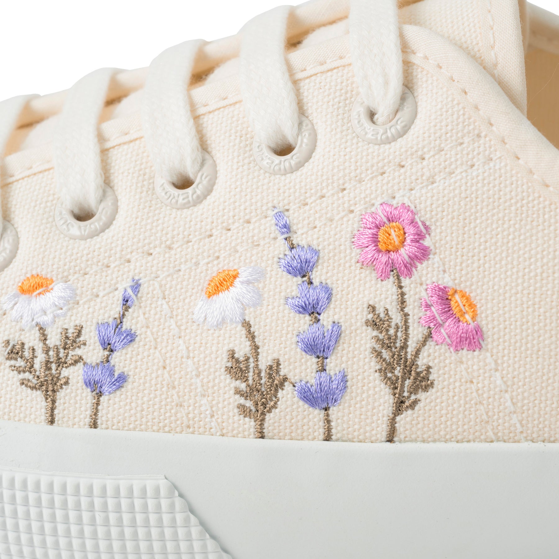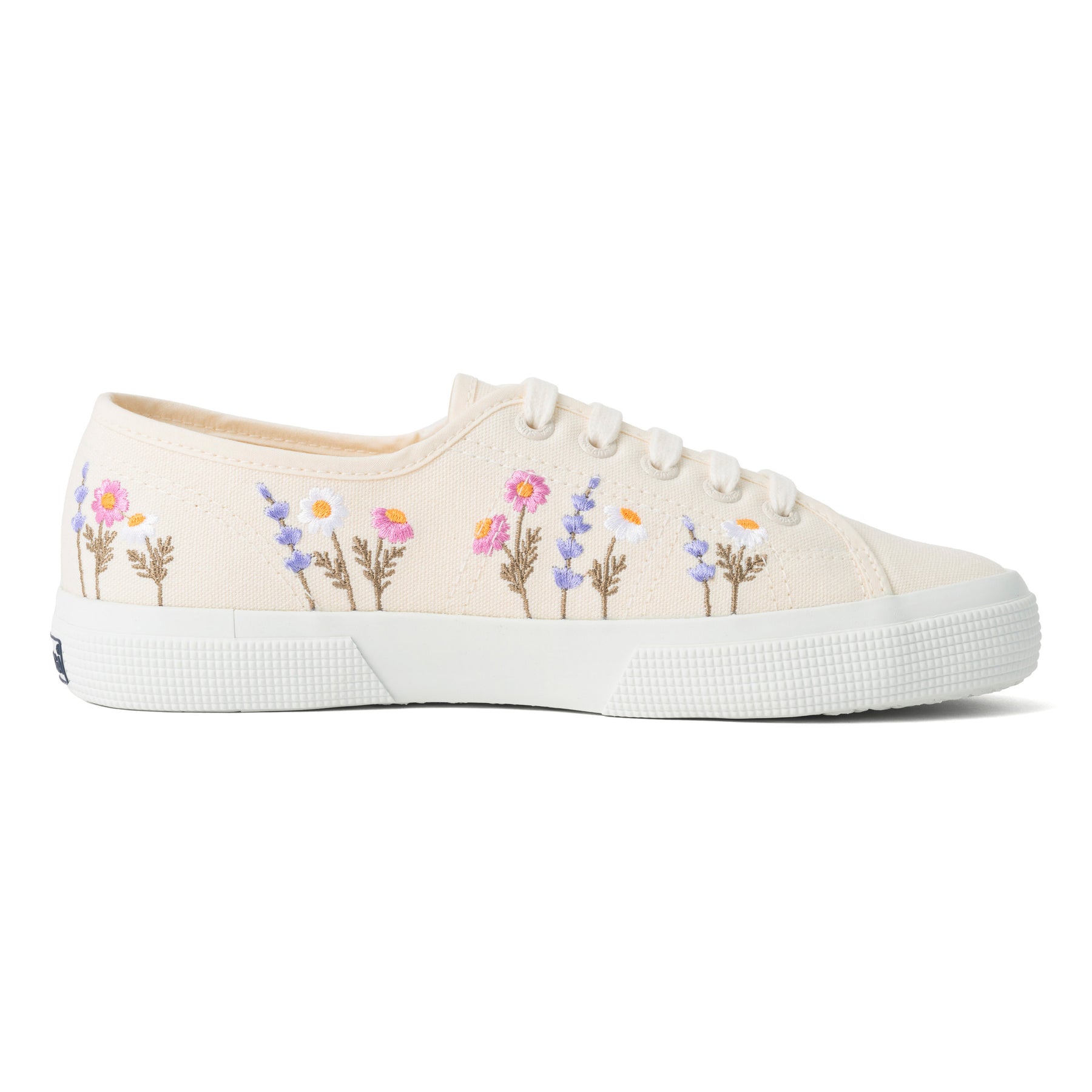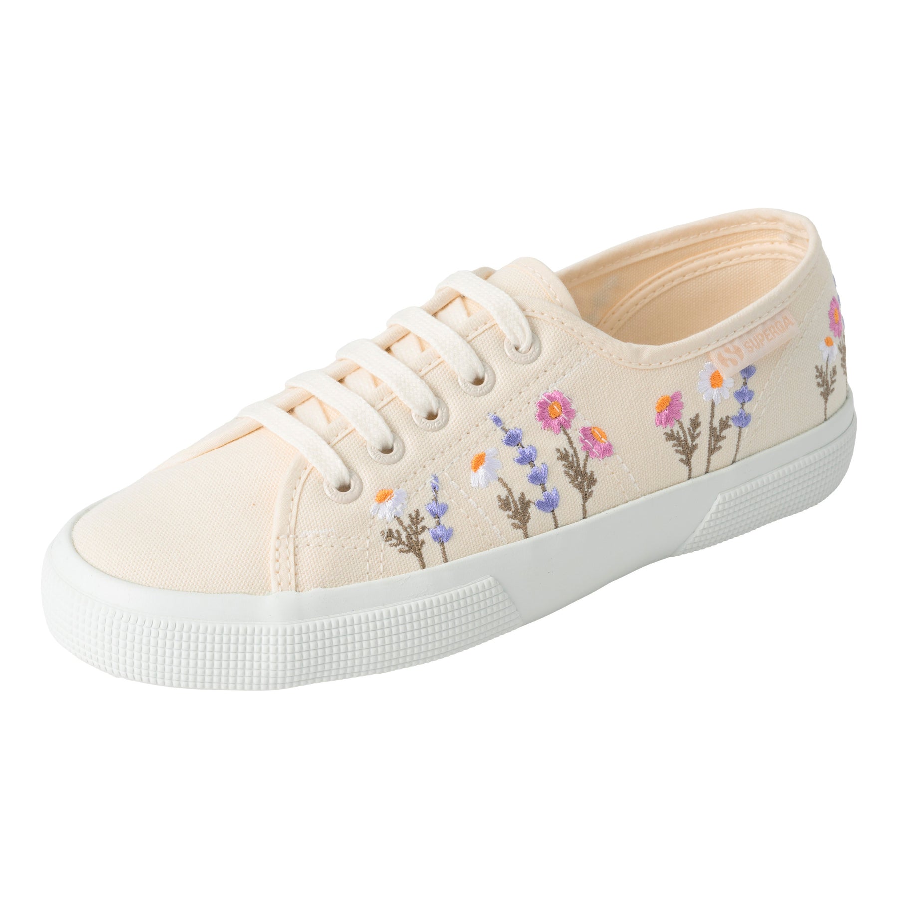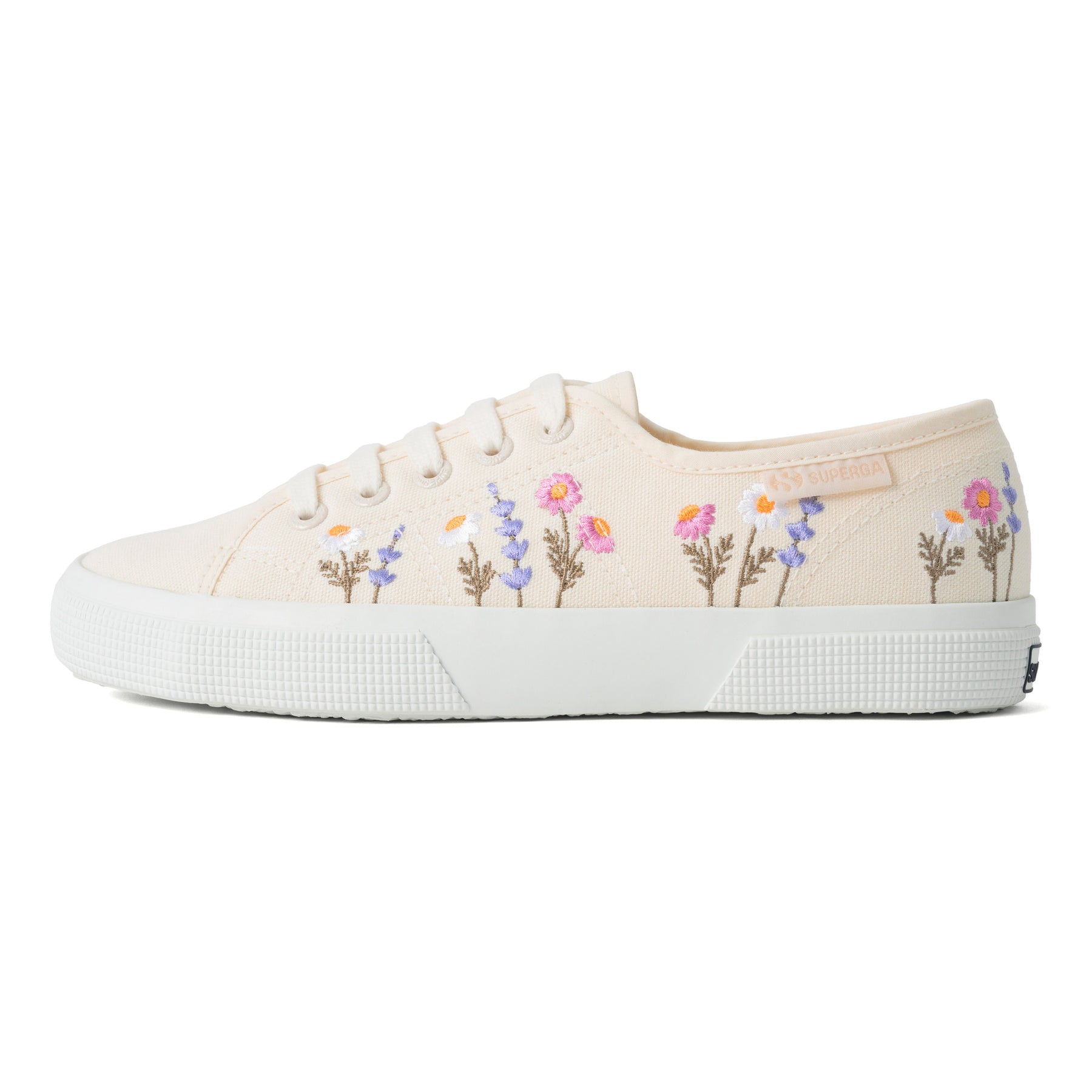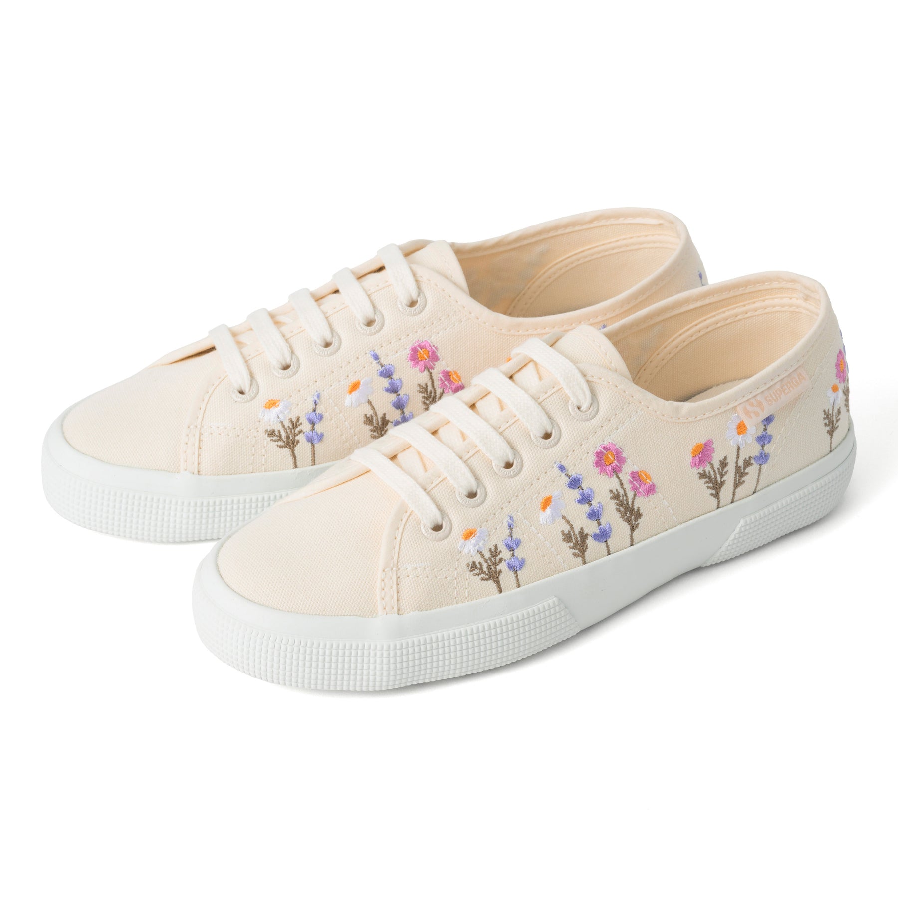 SUPERGA(スペルガ) を代表する定番モデル「3750」に、繊細な花柄刺繍を施した一足。ナチュラルなコットンアッパーに立体感のある刺繍が加わり、上品でやわらかな表情を演出します。サイドのジャカードロゴタグが、洗練されたアクセントとして全体を引き締めます。