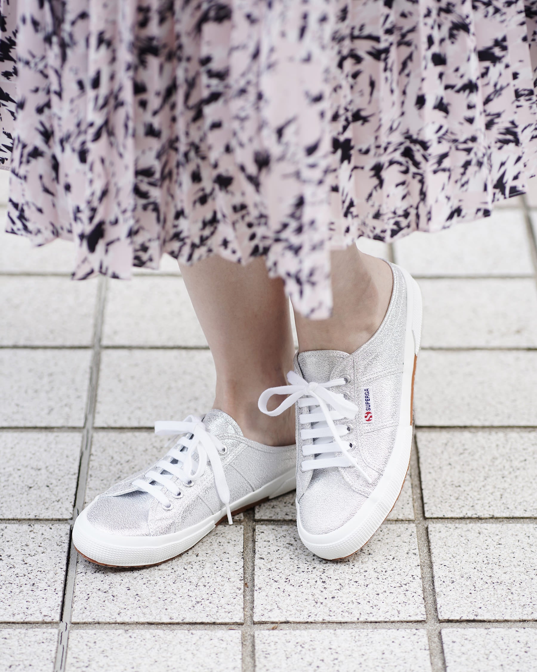 SUPERGAの定番となるラメスニーカー「2402 ラメ」は、上品で控えめなラメ感が特徴のミュールスタイルです。コンサバティブなきれいめコーディネートからカジュアルスタイルまで、幅広いファッションにマッチする一足です。